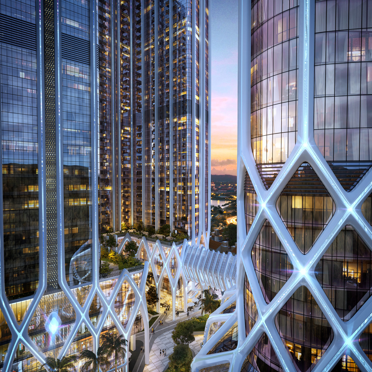 Diamond Crown Hai Phong là một trong những tòa tháp đôi đầu tiên tại châu Á sử dụng thiết kế mắt võng Diagrid kết hợp với những khối pha lê (Ảnh: DOJIRUBY).