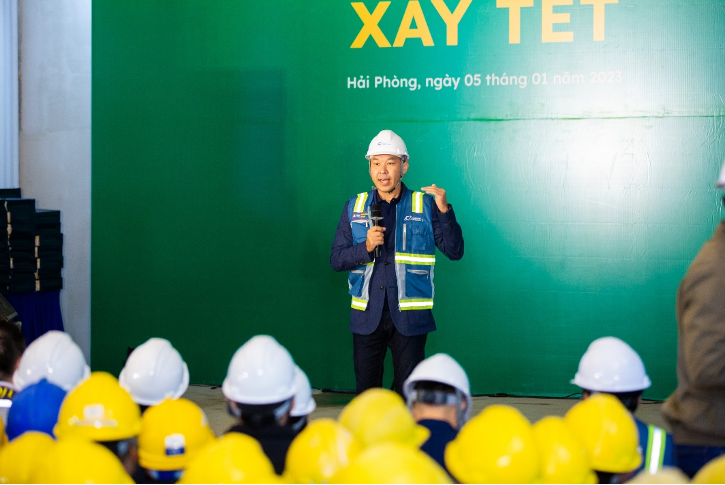 Ông Dương Anh Tuấn, Phó TGĐ Tập đoàn DOJIRUBY, Chủ tịch của Công ty Hải Phòng Invest, đại diện chủ đầu tư trao quà cho các công nhân tại công trường dự án
