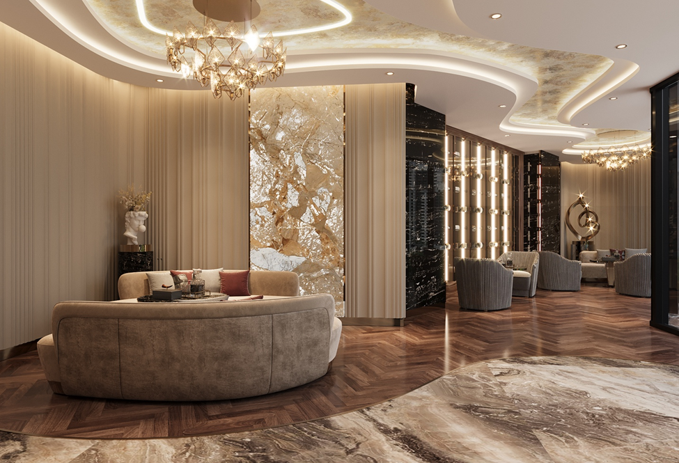 Ngay từ khoảnh khắc trở về đầu tiên, chào đón quý chủ nhân là sảnh vàng vương giả cao gần 5m, được chạm khắc tỉ mỉ với những đường line vàng, đèn chùm pha lê thiết kế riêng và họa tiết độc bản của đá tự nhiên nguyên khối. Đại sảnh với diện tích lớn, được ứng dụng công nghệ vào vận hành, đảm bảo chất lượng không gian luôn tương đương với tiêu chuẩn của khách sạn 5 sao.