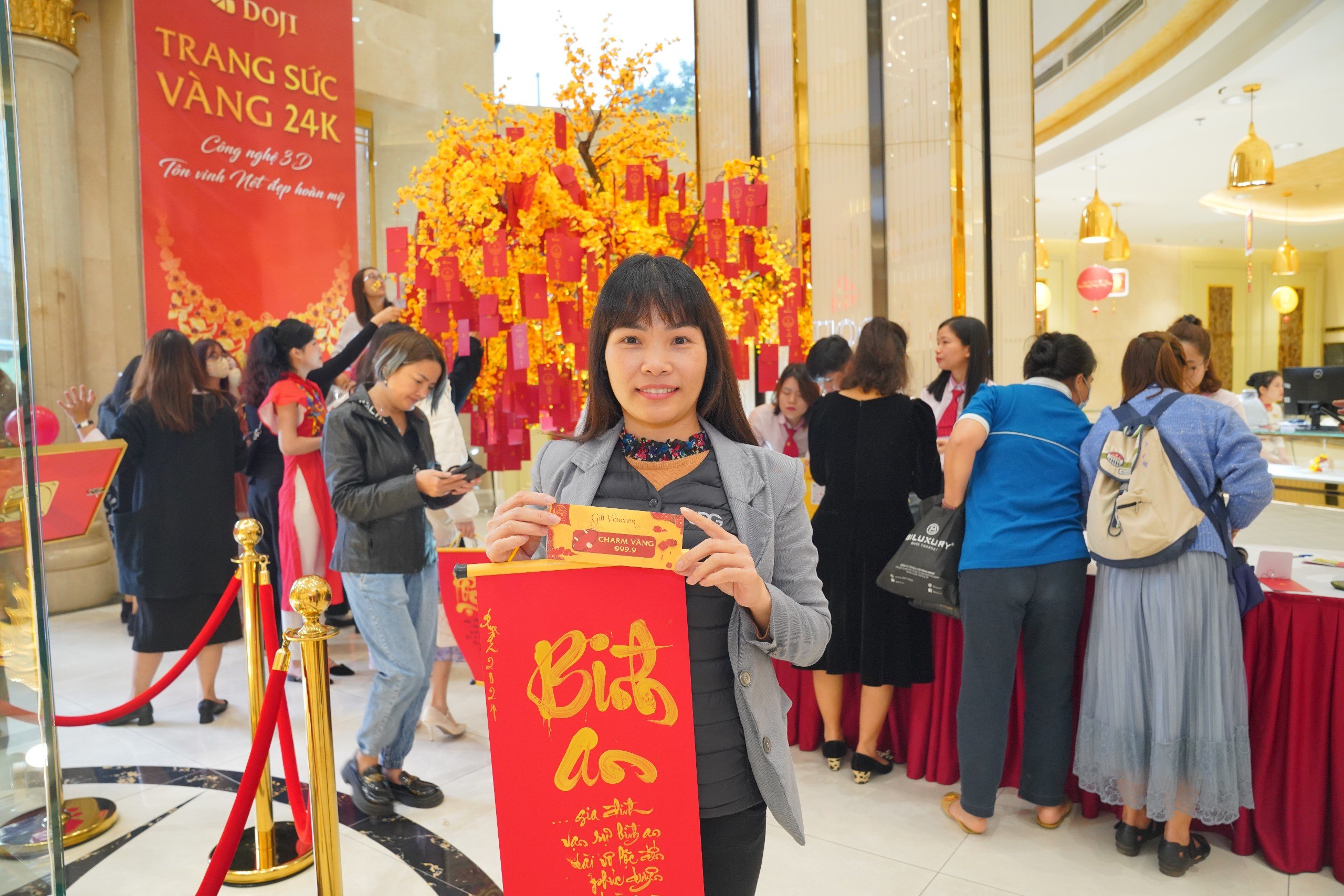 Nữ khách hàng ở Hoàng Mai- Hà Nội rất bất ngờ và phấn khởi khi may mắn hái được lộc đầu xuân của DOJI là 0,5 chỉ vàng.