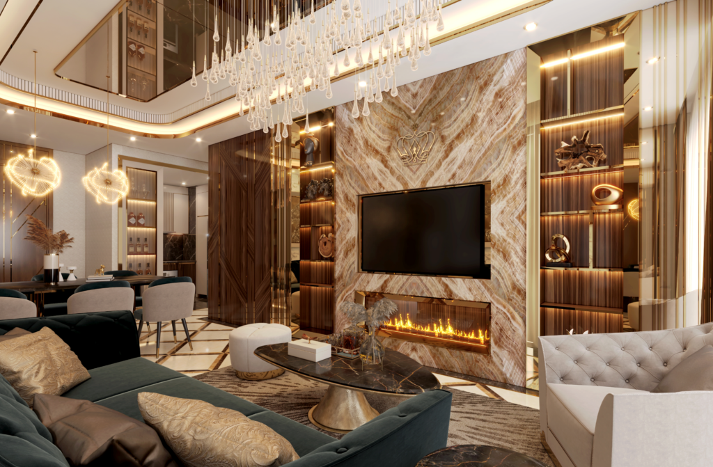 Tổng thể căn hộ được thiết kế hài hòa giữa sự sang trọng, khí chất hoàng gia, xen lẫn với nét đẹp tinh tế, hiện đại. Không gian mở với trần cao, vách kính lớn, cách bố trí ánh sáng thông minh tạo cảm quan chung rộng rãi, thoáng đãng, mang đến sự thư thái cho chủ nhân từ bước chân đầu tiên trở về nhà. Phòng khách liên thông với bếp tạo ấn tượng về sự ấm cúng và phóng khoáng. Đây sẽ là khu vực để gia chủ tận hưởng những phút giây bên người thân, hoặc được bố trí sắp đặt khéo léo cho những bữa tiệc thân mật tại gia.