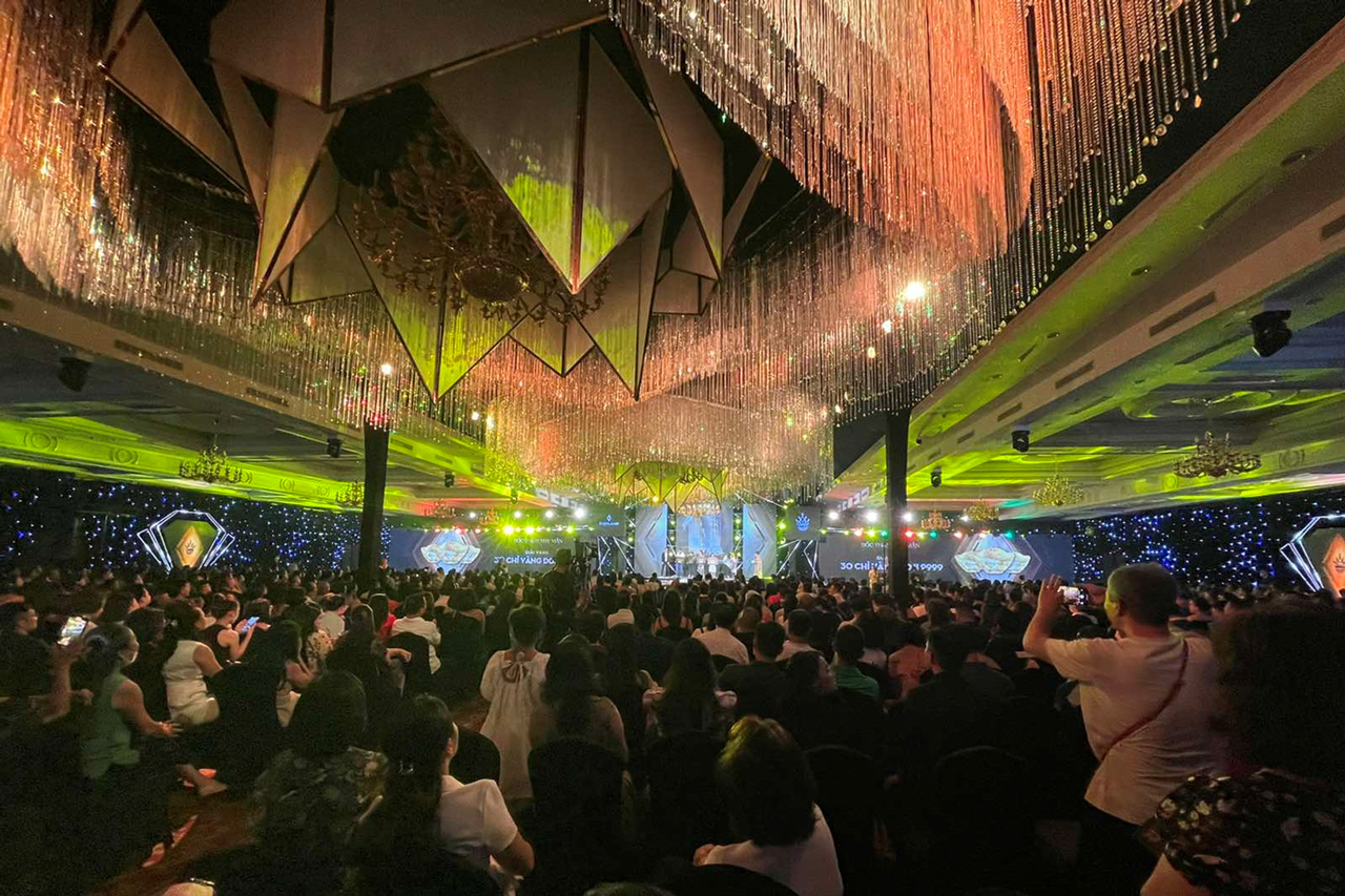 xung quanh là hệ thống màn sao kết hợp hiệu ứng Led Matrix, khách mời như được chìm đắm giữa ngàn ánh