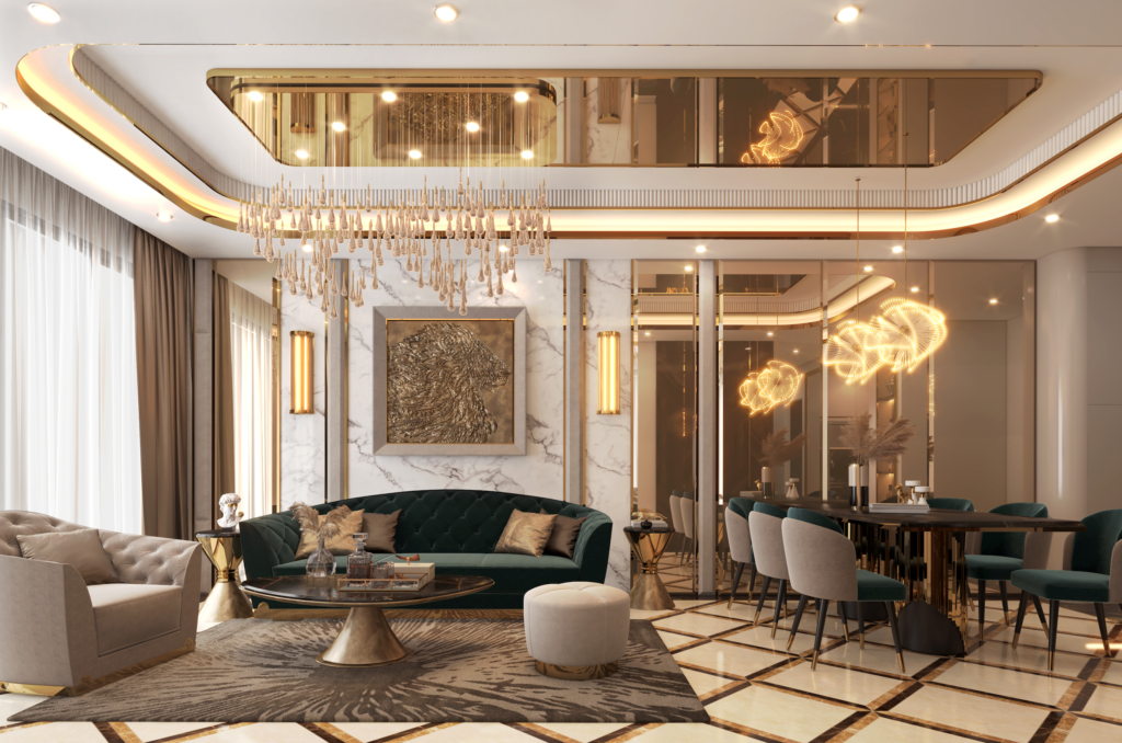 Tổng thể căn hộ được thiết kế hài hòa giữa sự sang trọng, khí chất hoàng gia, xen lẫn với nét đẹp tinh tế, hiện đại. Không gian mở với trần cao, vách kính lớn, cách bố trí ánh sáng thông minh tạo cảm quan chung rộng rãi, thoáng đãng, mang đến sự thư thái cho chủ nhân từ bước chân đầu tiên trở về nhà. Phòng khách liên thông với bếp tạo ấn tượng về sự ấm cúng và phóng khoáng. Đây sẽ là khu vực để gia chủ tận hưởng những phút giây bên người thân, hoặc được bố trí sắp đặt khéo léo cho những bữa tiệc thân mật tại gia.